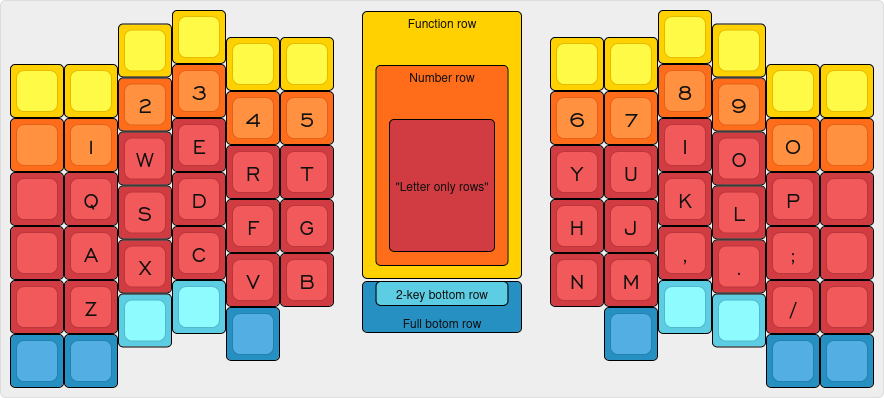 If you get a new Cyboard you're going to likely find that adapting to the pinky keys (the outer most two columns of keys on both sides) is going to take a few weeks. I especially struggled with accurately hitting the keys 1/! =/+ on the left pinky, and 0/) and -/_ on the right pinky. The reason I'm not listing this as a con is that this is by-design. These pinky key columns are intentionally shifted downward in order to accommodate the reality that your pinky finger is far shorter than the rest of your fingers. Be patient and you'll adapt and then this will be a positive thing for you.